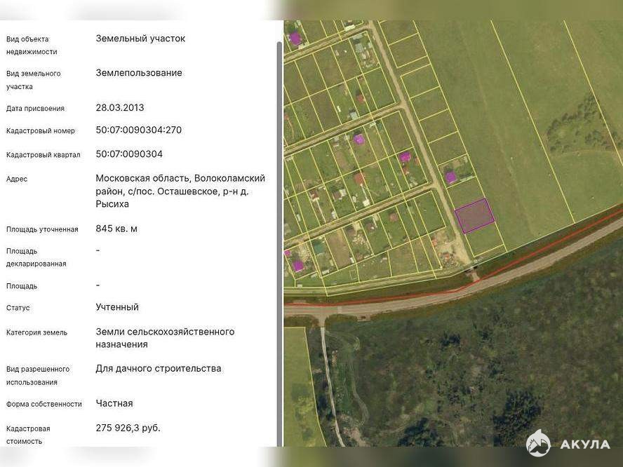 Имущество реализуется путем проведения торгов в форме аукциона в соответствии с Федеральным законом "О несостоятельности (банкротстве) " от 26.10.2002 №127-ФЗ. Земельный участокплощадь 845 +/- 20 кв. мкатегория земель: земли сельскохозяйственного назначениявид разрешенного использования: для дачного строительствакадастровый номер 50: 07: 0090304: 270месторасположение Московская область, Волоколамский район, с/пос. Осташевское, р-н д. РысихаПрием заявок будет осуществляться на сторонней электронной торговой площадке, задаток 10%. Помощь от Сбербанка - Агентский сервис по участию на торгах. Агент за Вас оформит документы, подаст заявку и примет участие на торгах. Специалисты Банка сопровождают процедуру участия в торгах "под ключ": - регистрация на ЭТП;- подача заявки;- торги;- сопровождение сделки купли-продажи.