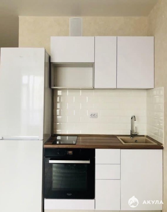 Полностью оборудованная кухня: холодильник, плита с 4 конфорками, духовка, микроволновка, электрический чайник, небольшой набор посуды.
